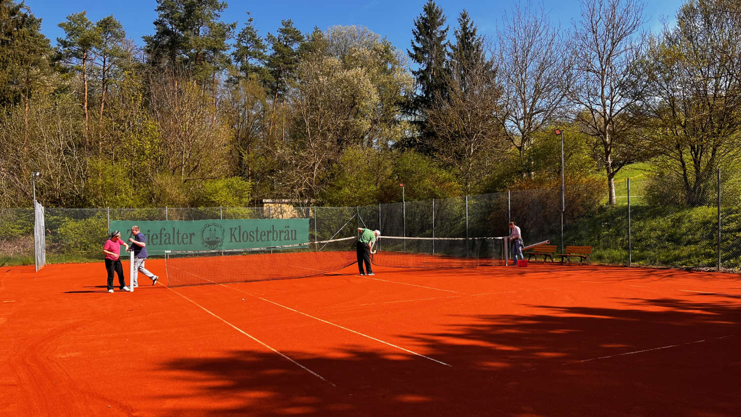 Bei einem kurzfristigen Arbeitseinsatz am Samstag, den 18.04.2026 bei bestem Tennis-Wetter wurden die Netze gespannt, die Bänke geputzt und rausgetragen und die Ergebnistafeln aufgehängt. Nun kann auch schon vor der offiziellen Saisoneröffnung am 11. Mai fleißig gespielt werden, um die Plätze zu testen. Viel Spaß dabei!